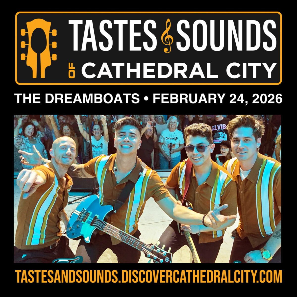 This week’s Tastes & Sounds 2026 is THE DREAMBOATS with food provided by Smokey Dawgs. Gates open at 5pm. Lawn chairs and blankets are suggested. This event is BYOB.
